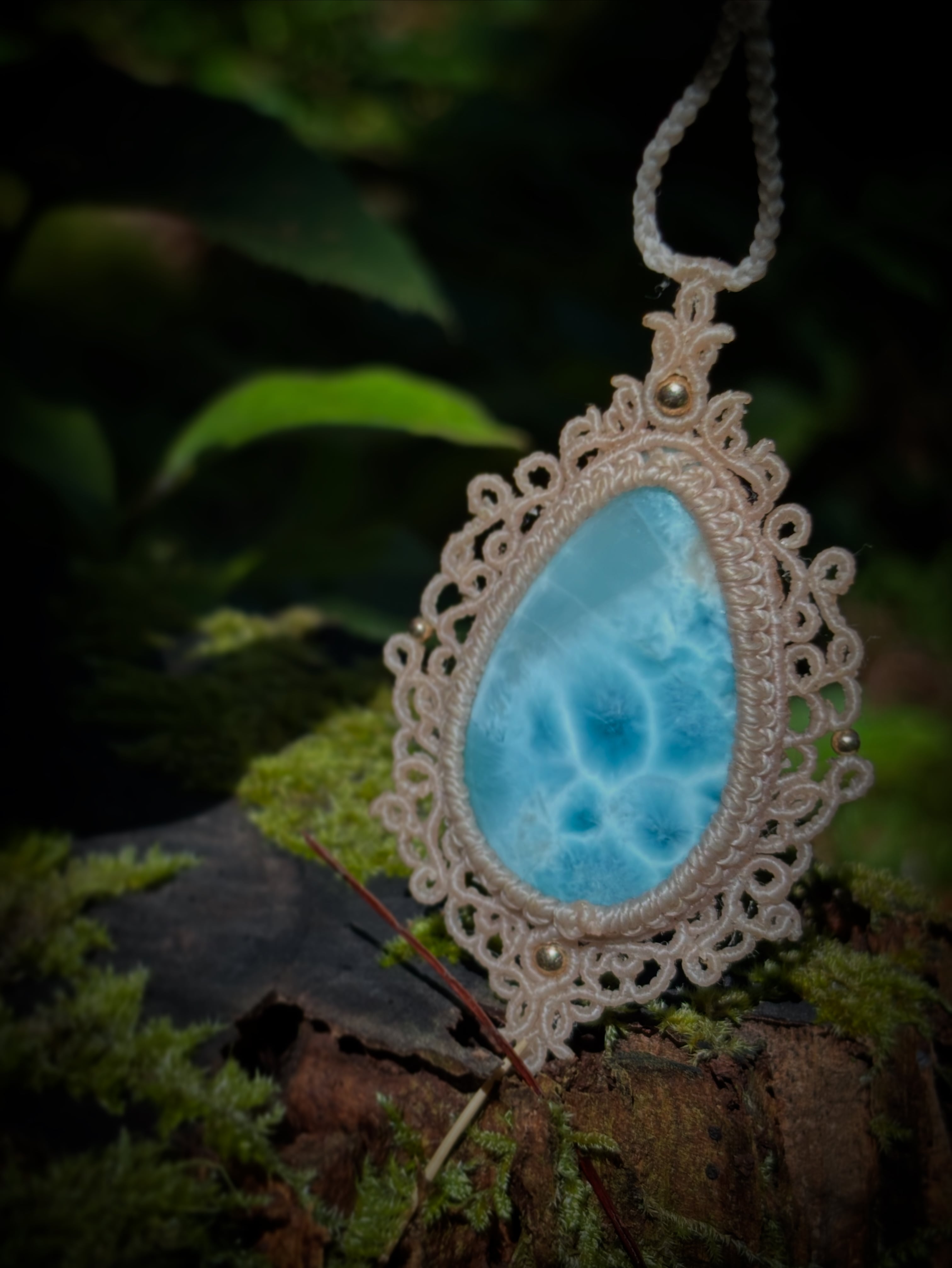 優しい波の雫のようなラリマーを、キナリ色のコードでひと編みひと編み心を込めて飾りました。