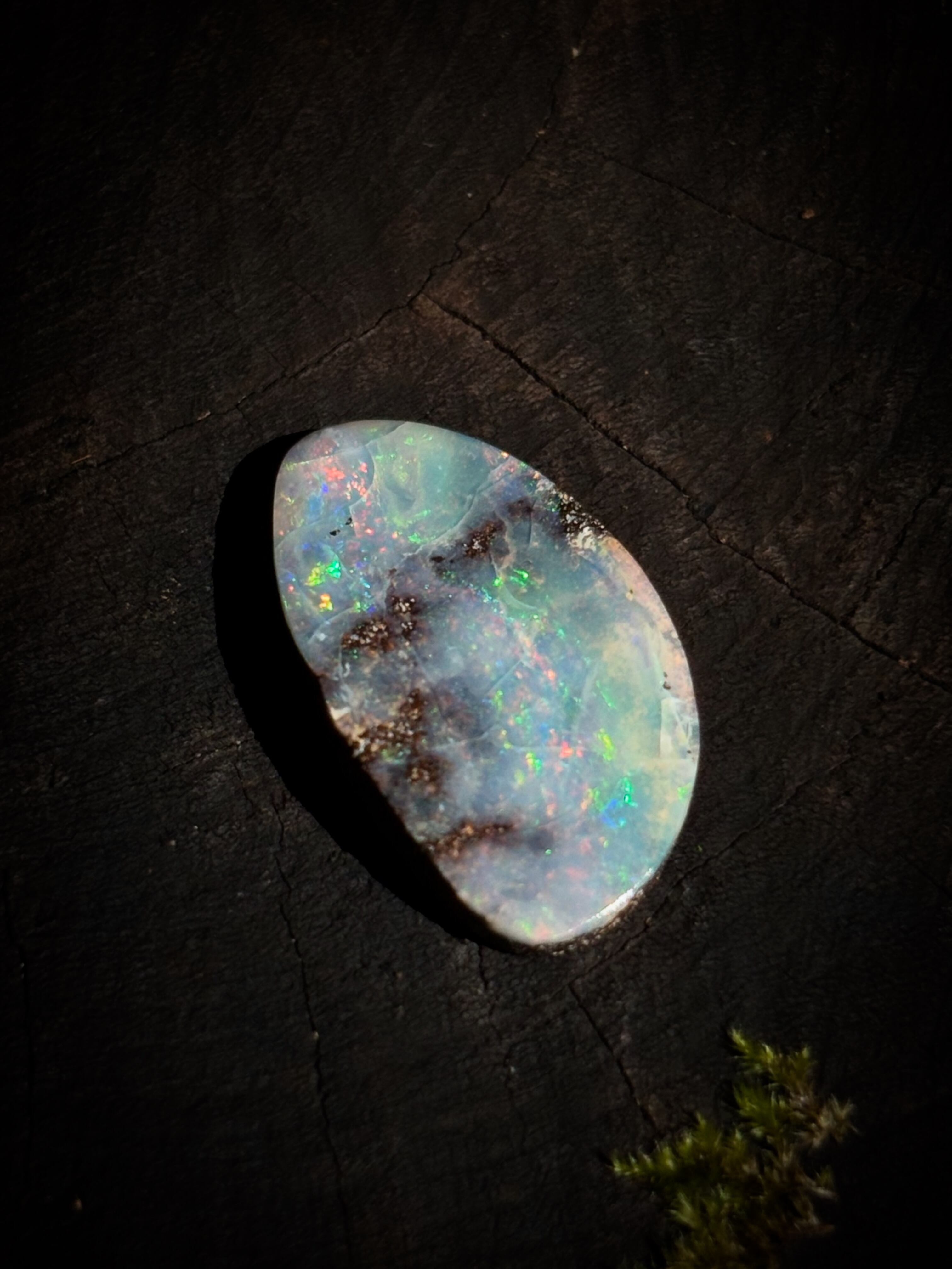 全体に広がるオパールに虹色の遊食が美しいボルダーオパールです。